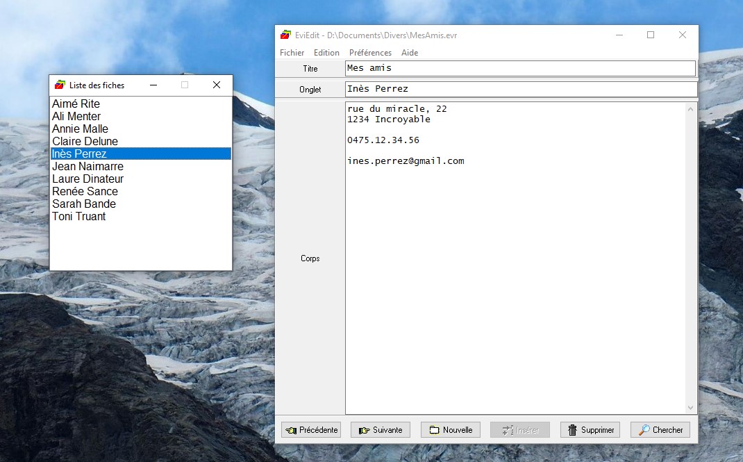 EviEdit permet de récolter et consulter des données de toutes sortes sous forme de fiches, sans s'encombrer de la lourdeur d'une base de données classique. Consultation et ajout de fiches aisés, classement automatique, liste des onglets, recherche, impression, etc. L'option "garder à l'avant-plan" est particulièrement pratique lorsque vous voulez utiliser vos données dans une autre application tout en gardant votre fiche visible à l'écran.